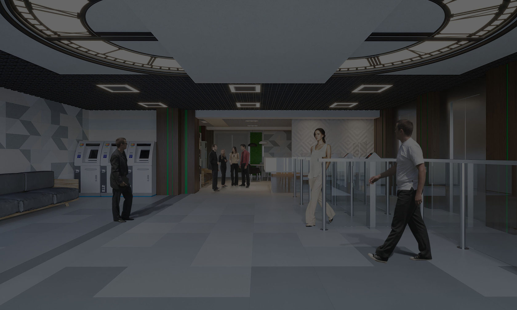 В поисках концепции мы пошли не только от названия офисного центра, но и от самого параметра часов. Часы символизируют время, поэтому циферблат здесь ключевой элемент дизайна. Публика здесь довольно различная и угодить всем- это значит сделать современную нейтральную стилистику, которую мы разбавили акцентами эко-стиля.