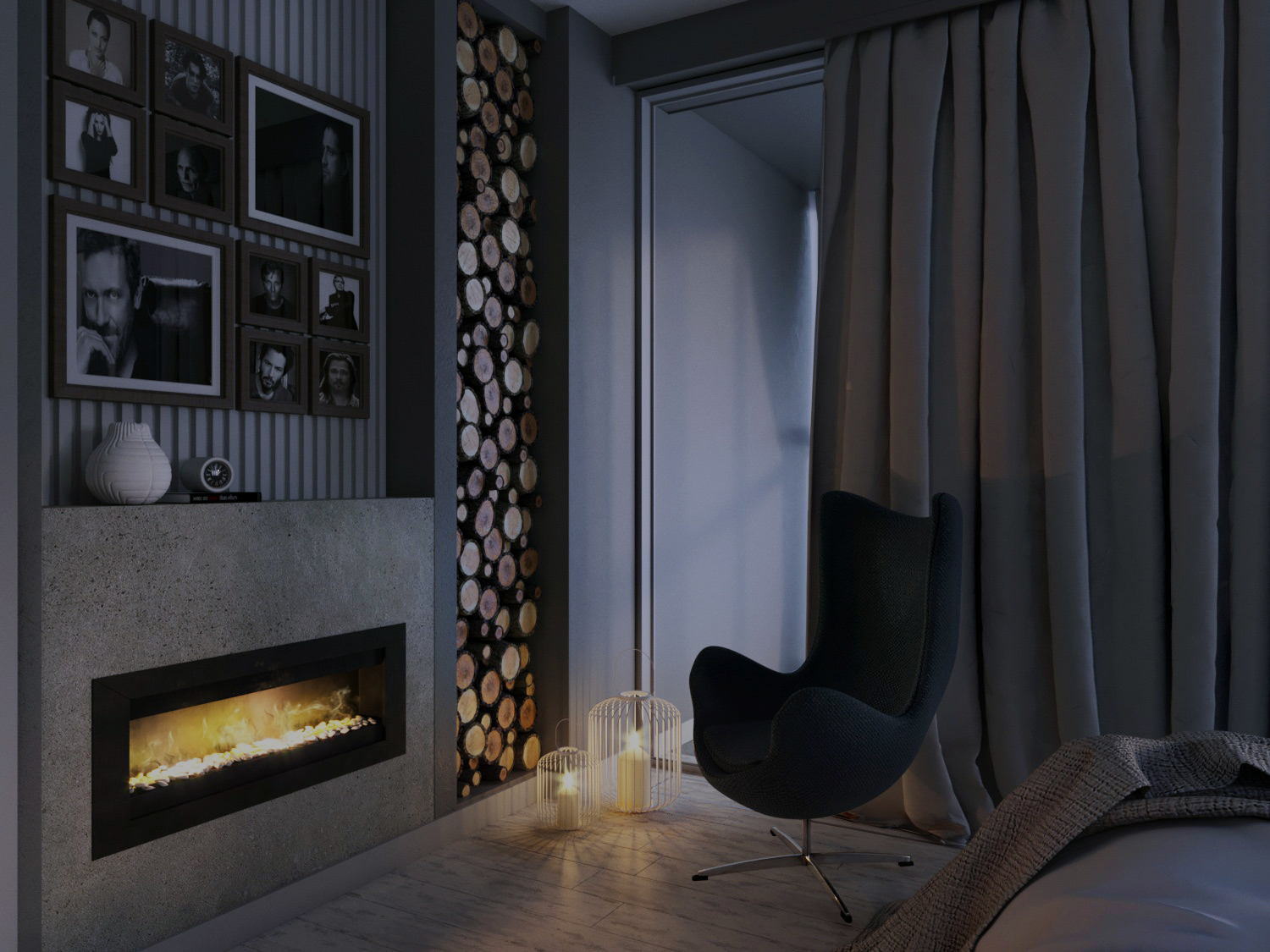 Хозяйская спальня, на наш взгляд, самое уютное помещение во всей квартире. Тут большие окна, много света и воздуха. Спальня зонирована на рабочее пространство и зону отдыха и сна. Рабочую зону можно закрыть портьерой и сидеть допоздна, не мешая отдыхать другому человеку. Камин в квартире - просто мечта. Мы поставили электрический очаг и задекорировали стену рядом под дровник для большей атмосферности.