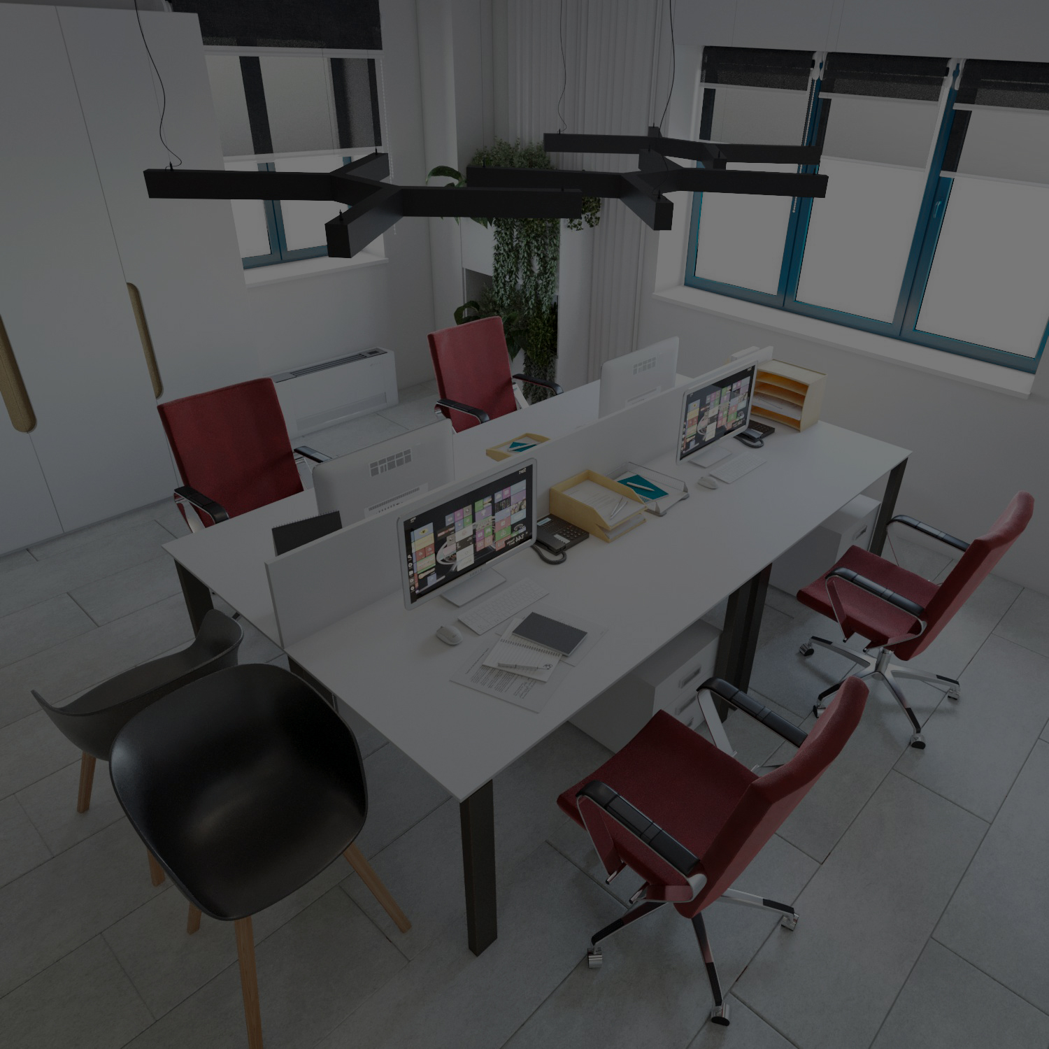 В основу концепции дизайна легло светлое пространство ( освежили существующие стены), которое было удачно скомбинировано с алюминиевыми конструкциями с большой площадью стекла и деревянными панелями. Яркие акценты в виде стульев обращают наше внимание к знаковому элементу фирмы заказчика - это красный квадрат. Локально мы добавляли гипсовые панели и элементы зелени, что бы равномерно распределить финансы, при этом не уменьшить эффект от общего вида интерьера. Конечно кабинеты руководителей были сделаны каждый в своем образе, но не разделимы единым стилем. Нам удалось создать пространство для каждого индивидуально, в процессе мы много общались и пришло понимание кому и в каких условиях и с каким функционалом будет комфортно работать.