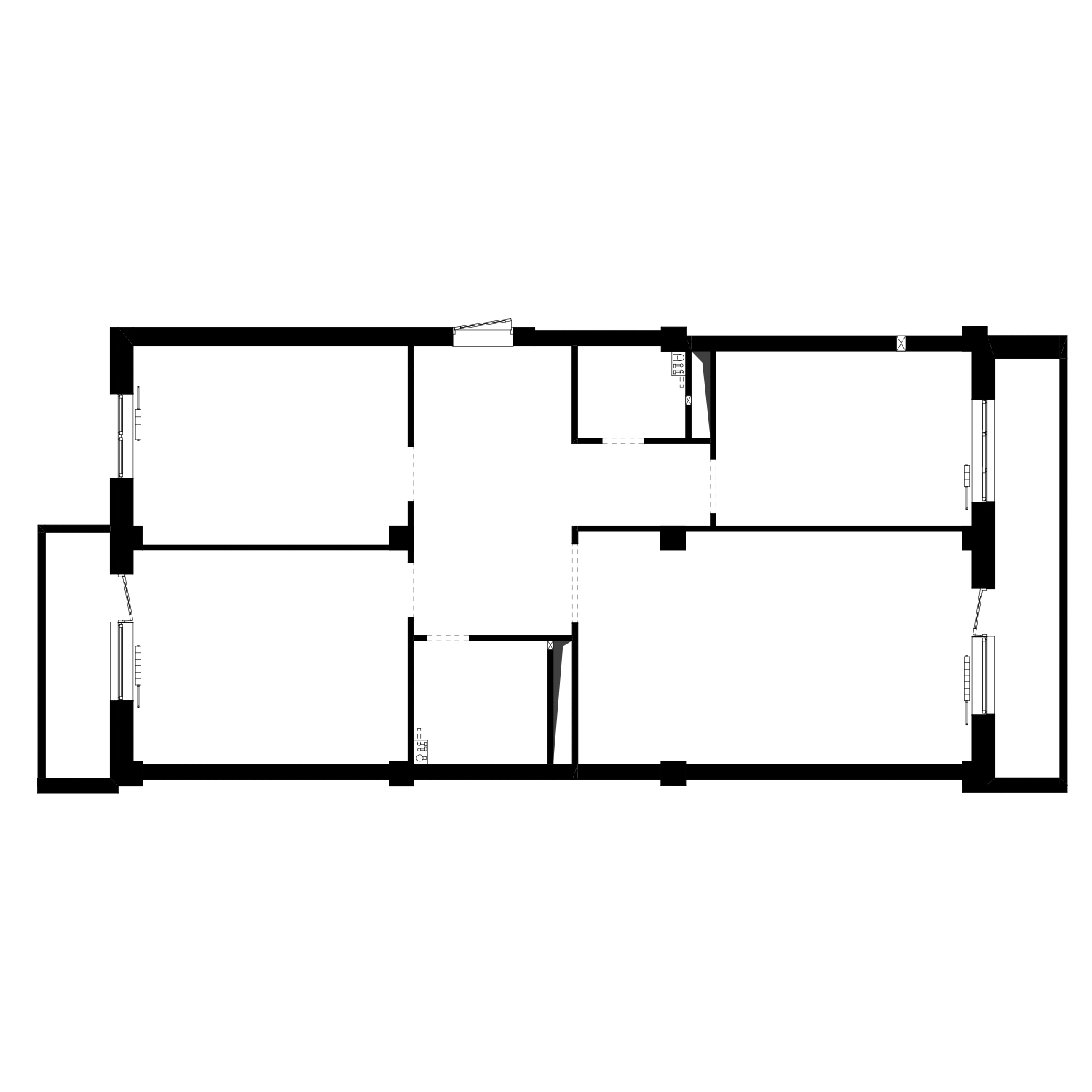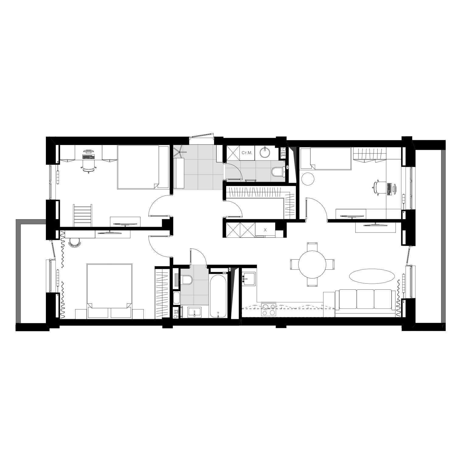 Таким образом мы получили просторную кухню-гостиную, спальню, детскую комнату, два сан/узла и кабинет, который может также выполнять роль гостевой комнаты.