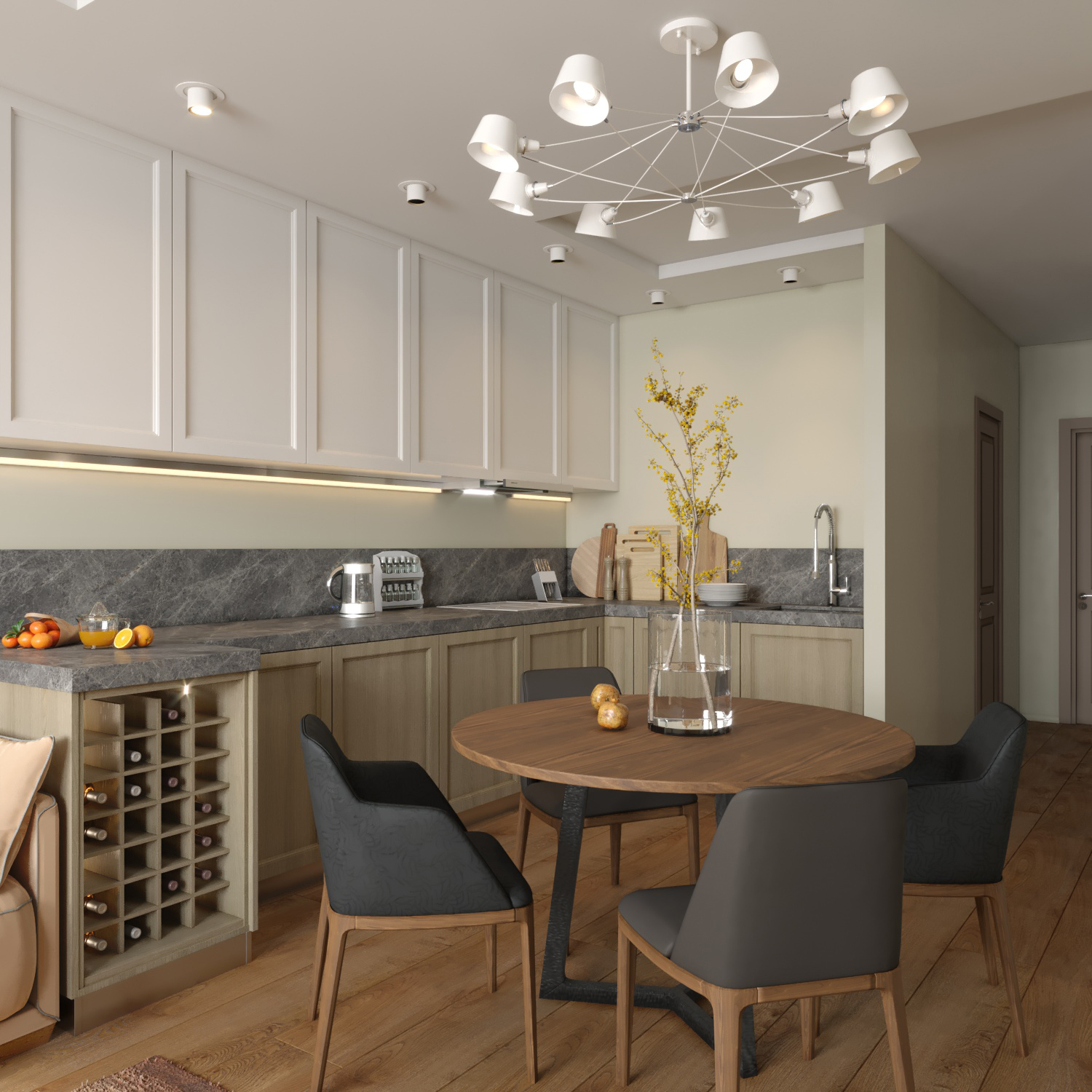 В кухне-гостиной удачно разделены кухонная зона и зона отдыха с диваном. Освещение также разделено по группам: рабочая поверхность подсвечивается точечными светильниками и встроенной подсветкой, большая люстра в центре композиционно выделяет обеденную группу, а над телевизором предусмотрена подсветка для мягкого вечернего освещения.