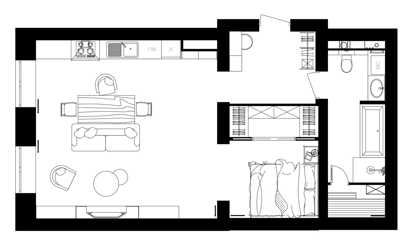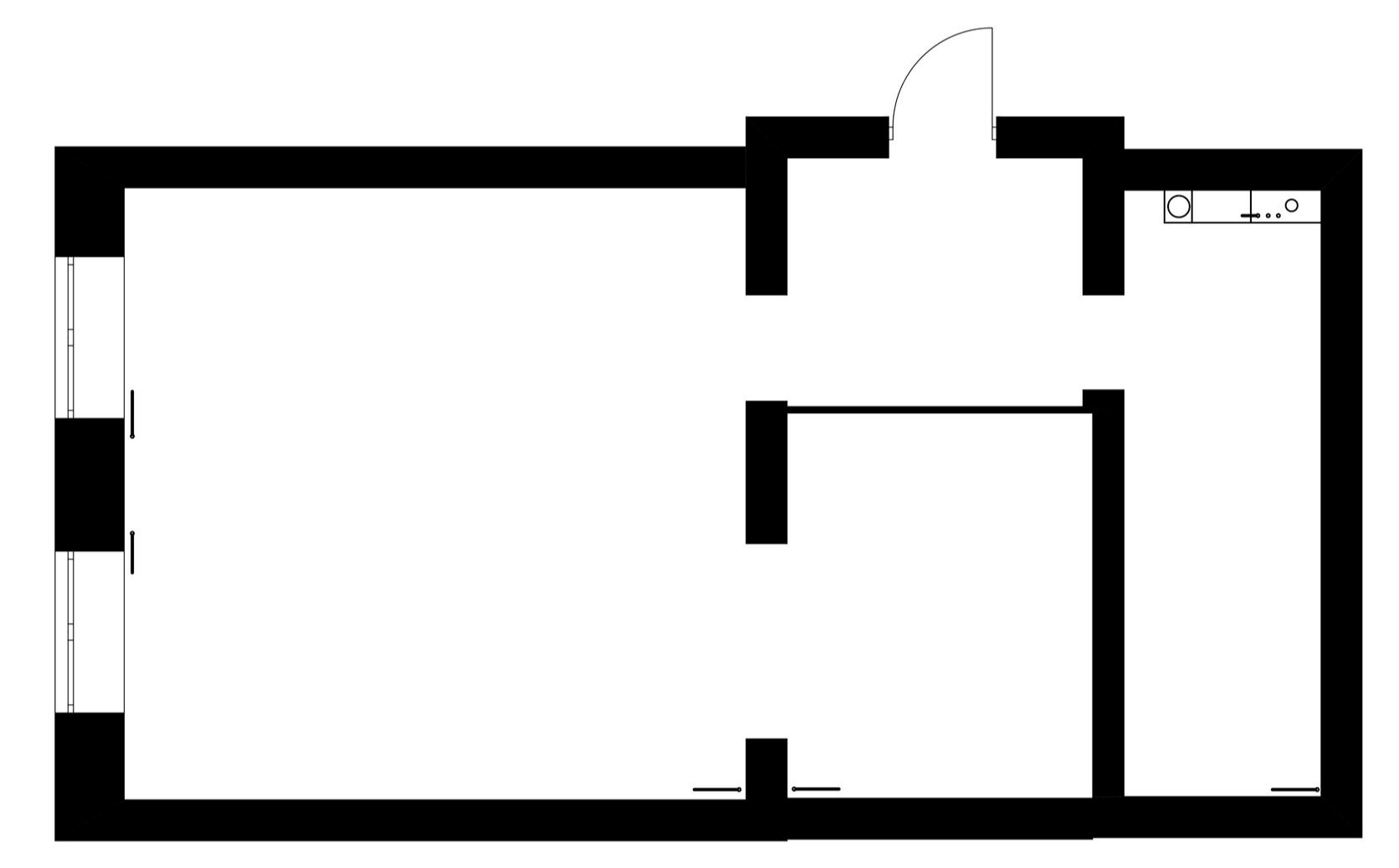 Квартира-студия была приобретена родителями для своей дочери. Необычный дом в старом городе с необычной планировкой был выбран нашими заказчиками. Два высоких окна в большой просторной комнате сразу же привлекли наше внимание, а вытянутое пространство санузла очень удивило. В большой комнате мы сделали кухню-гостиную, маленькую комнату отдали под спальню с гардеробной, которую отделили большими раздвижными дверьми. А вот с ванной комнатой все намного интереснее. Тут разместился большой шкаф, в который мы спрятали коммуникации, раковина со стиральной машиной. ванная, душевая кабина и небольшая сауна на 2-х человек.