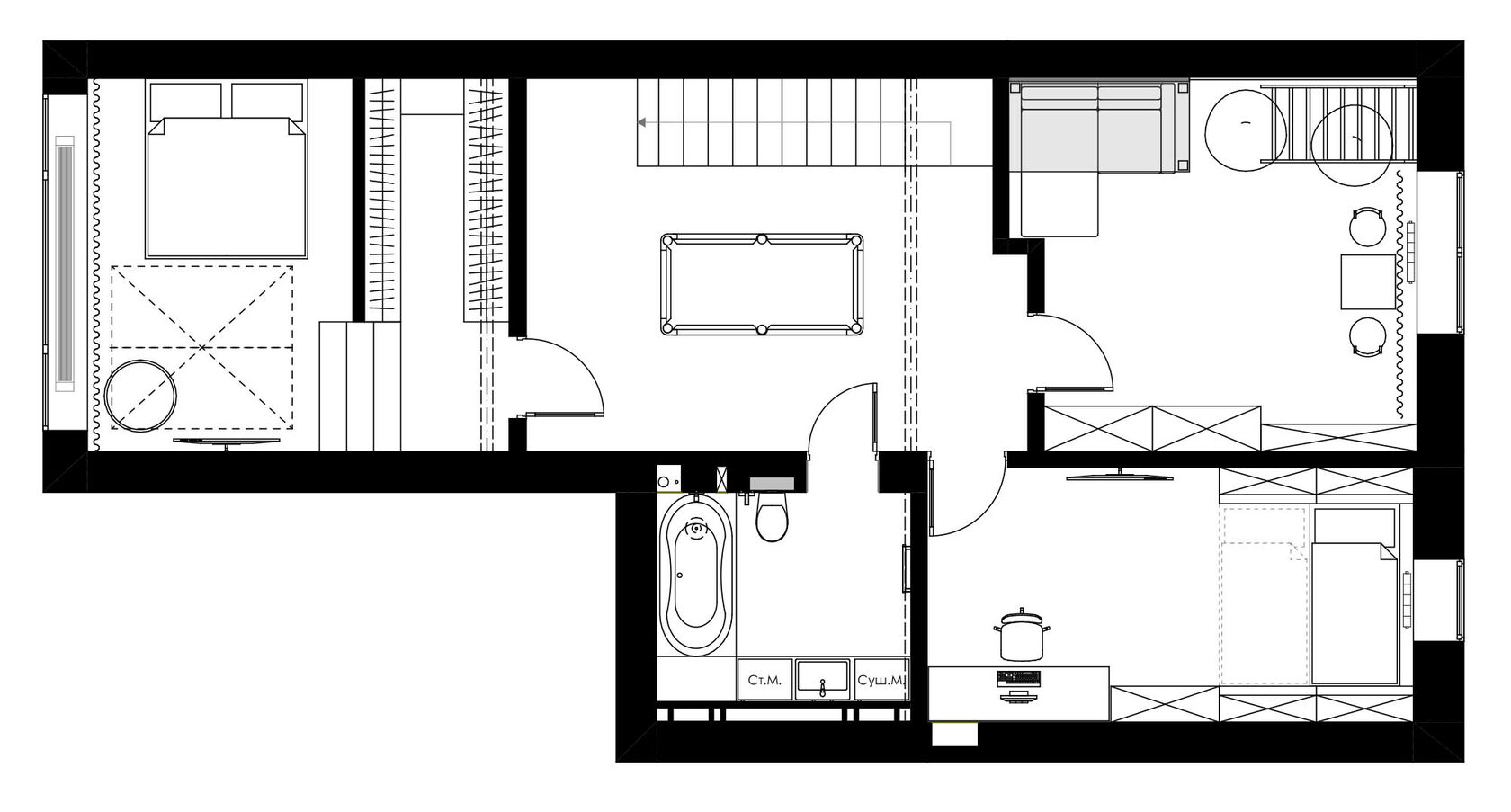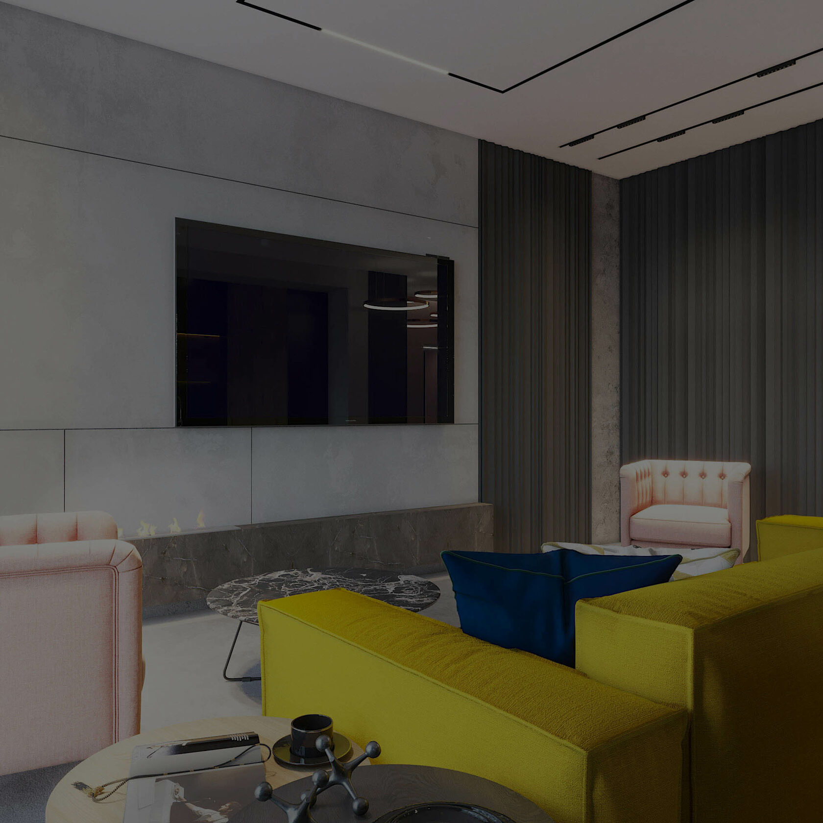 В данном проекте был запрос на яркий и динамичный дизайн интерьера, который бы подчеркивал характер проживающей там семьи. Нестандартное пространство квартиры и настрой заказчиков на эксперименты, позволили нам добавить в этот проект очень насыщенные цветовые акценты, на которые решился бы не каждый. На первом этаже расположены прихожая, кухня-гостиная, кинозал и сан/узел. На втором: общий холл с зоной отдыха, мастер-спальня с гардеробной, детская, ванная комната и кабинет.