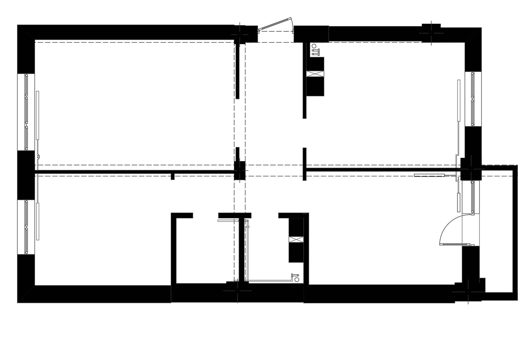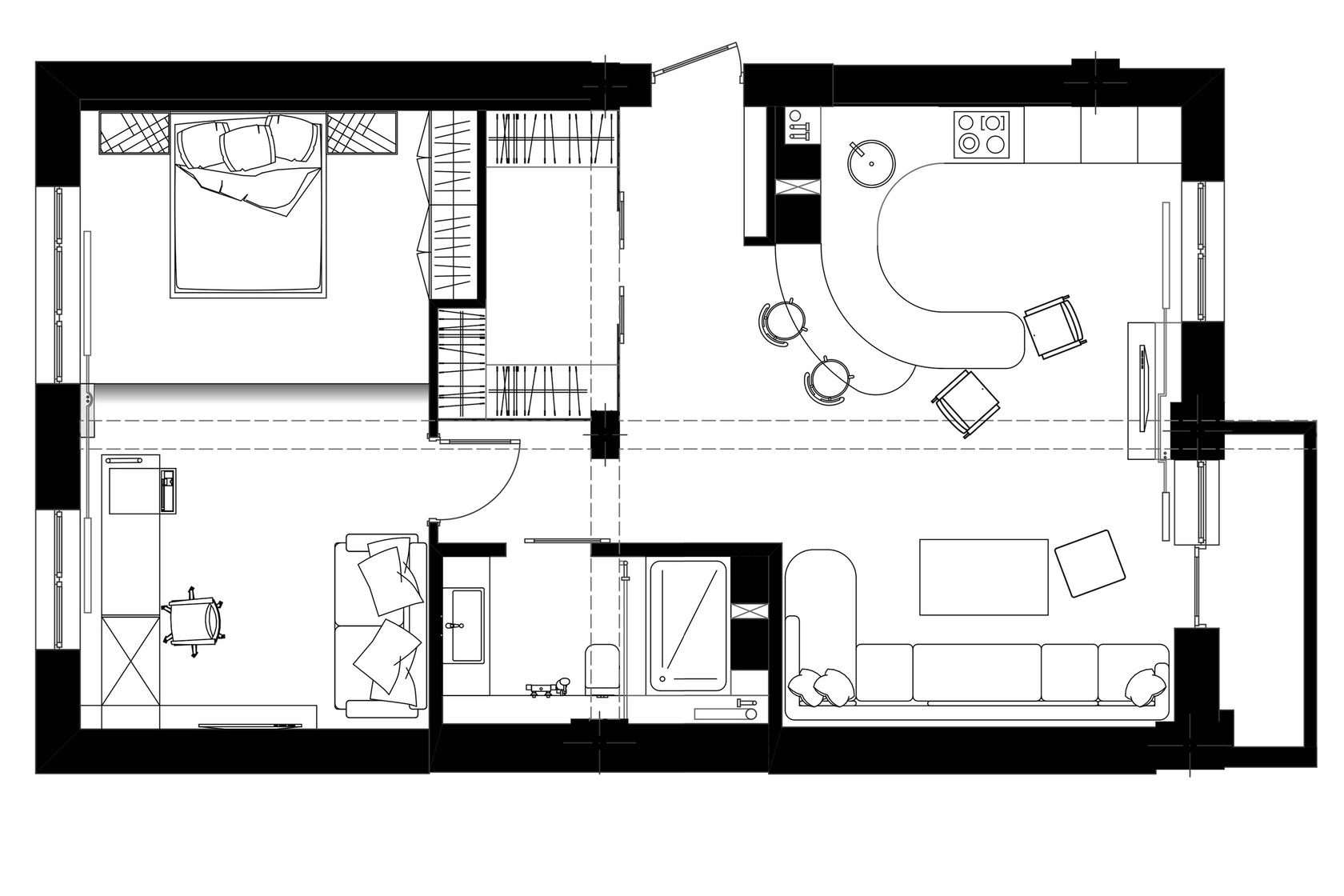 Квартира для холостяка с эффектным видом на Волгу. При перепланировке этой квартиры мы устроили при входе большую гардеробную, спроектированную полностью из стекла, объединили сан/узел и ванную комнату, сделали просторную кухню-гостиную, из которой открывается отличный вид, а также выделили приватную зону, в которой находится спальное место и рабочий кабинет. Кровать в новой большой спальне подняли на подиум.