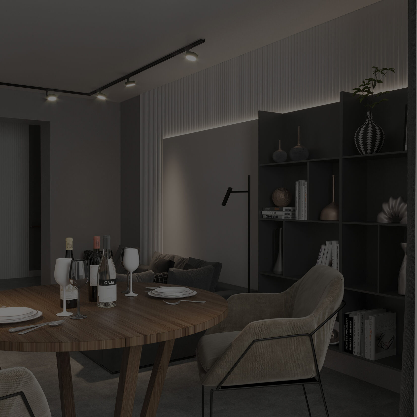 В концепции дизайна мы придерживались принципа минимализма, как в цветовой гамме так и в материалах отделки. Больше внимания было уделено разнообразным световым сценариям и разным видам освещения.